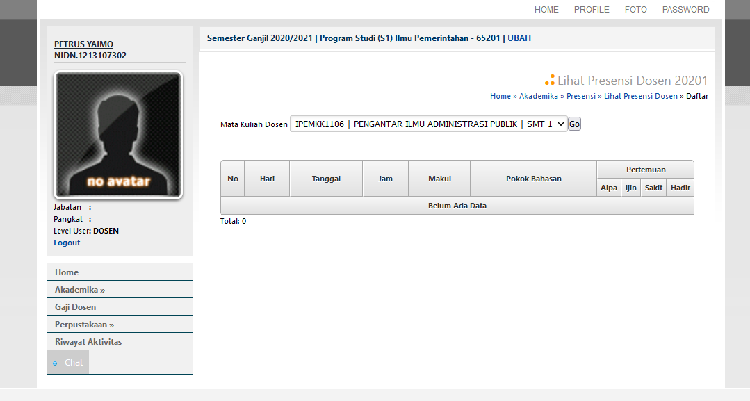 1. Pilih menu Akademika >> "Lihat Presensi Dosen" untuk memasukkan presensi dosen